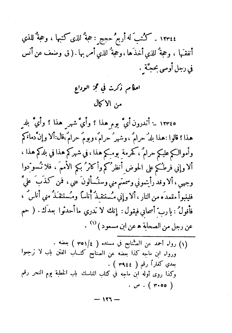 12345- أتدرون أي يوم هذا؟ وأي شهر هذا؟ وأي بلد هذا؟ قالوا: هذا بلد حرام، وشهر حرام، ويوم حرام، قال: ألا وإن دماءكم وأموالكم عليكم حرام، كحرمة يومكم هذا، في شهركم هذا في بلدكم هذا، ألا وإني فرطكم على الحوض أنظركم وأكاثر بكم الأمم، فلا تسودوا وجهي، ألا وقد رأيتموني وسمعتم مني وستسألون عني، فمن كذب علي فليتبوأ مقعده من النار، ألا وإني مستنقذ أناسا ومستنقذ مني أناس، فأقول: يا رب أصحابي فيقول: إنك لا تدري ما أحدثوا بعدك. "حم عن رجل من الصحابة هـ عن ابن مسعود"1