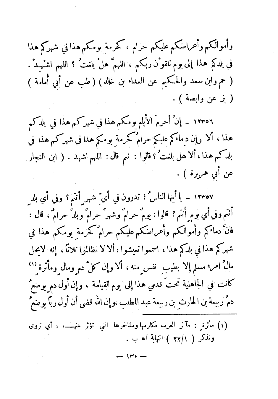 12357- يا أيها الناس؛ تدرون في أي شهر أنتم؟ وفي أي بلد أنتم وفي أي يوم أنتم؟ قالوا: يوم حرام وشهر حرام وبلد حرام، قال: فإن دماءكم وأموالكم وأعراضكم عليكم حرام كحرمة يومكم هذا في شهركم هذا في بلدكم هذا، اسمعوا تعيشوا، ألا لا تظالموا ثلاثا، إنه لا يحل مال امرء مسلم إلا بطيب نفس منه، ألا وإن كل دم ومال ومأثرة1 كانت في الجاهلية تحت قدمي هذا إلى يوم القيامة، وإن أول دم يوضع دم ربيعة بن الحارث بن ربيعة عبد المطلب، وإن الله قضى أن أول ربا يوضع