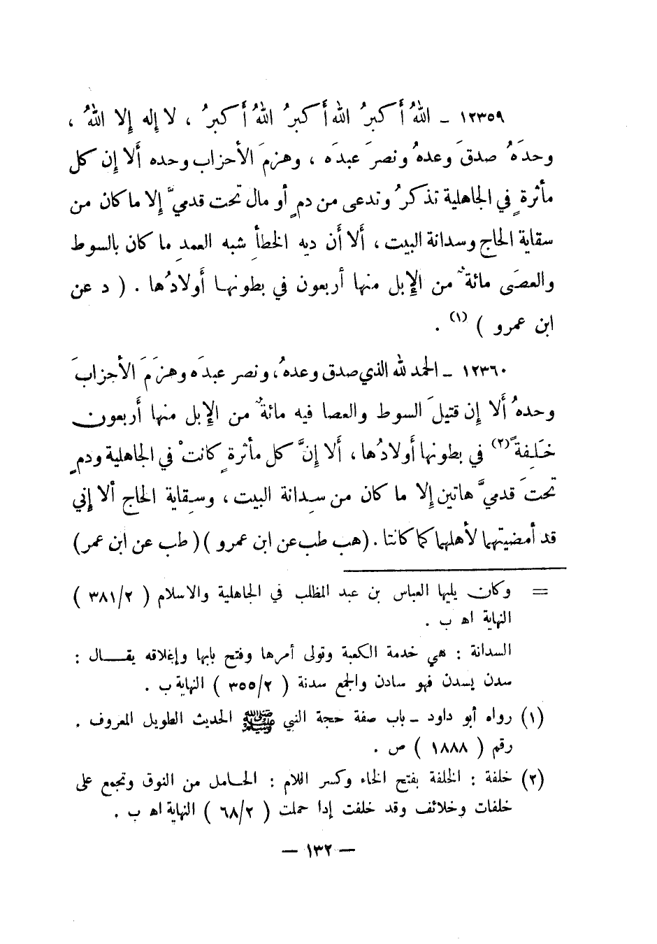 12359- الله أكبر الله أكبر الله أكبر، لا إله إلا الله، وحده صدق وعده ونصر عبده، وهزم الأحزاب وحده ألا إن كل مأثرة في الجاهلية تذكر وتدعى من دم أو مال تحت قدمي إلا ما كان من سقاية الحاج وسدانة البيت، ألا إن دية الخطأ شبه العمد ما كان بالسوط والعصى مائة من الإبل منها أربعون في بطونها أولادها. "د عن ابن عمرو"1