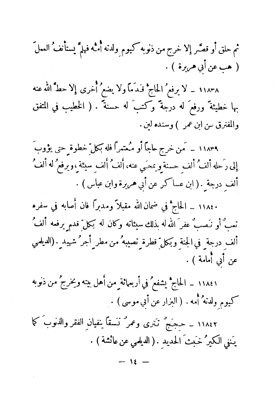 11838- لا يرفع الحاج قدما ولا يضع أخرى إلا حط الله عنه بها خطيئة ورفع له درجة وكتب له حسنة. " الخطيب في المتفق والمفترق عن ابن عمر" وسنده لين.