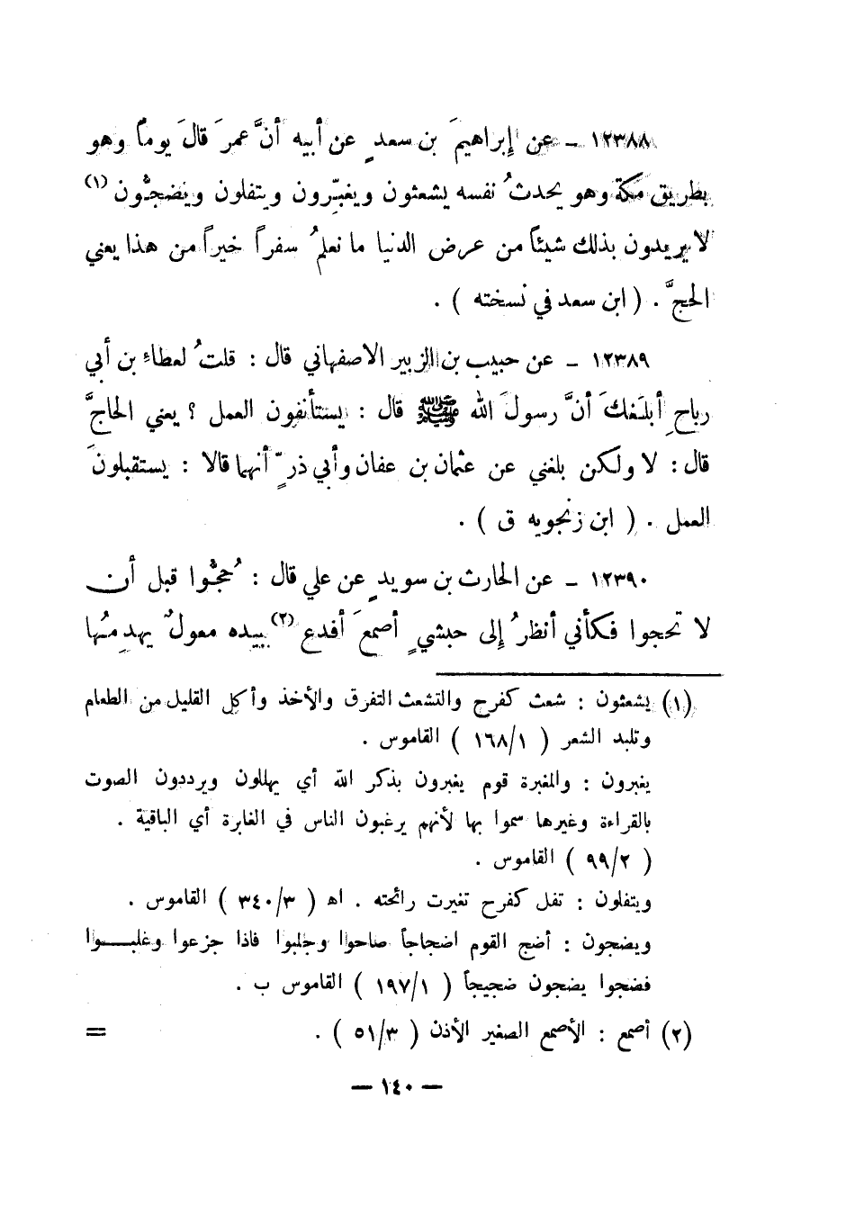 12389- عن حبيب بن الزبير الأصفهاني قال: قلت لعطاء بن أبي رباح أبلغك أن رسول الله صلى الله عليه وسلم قال: يستأنفون العمل؟ يعني الحاج قال: لا ولكن بلغني عن عثمان بن عفان وأبي ذر أنهما قالا: يستقبلون العمل. "ابن زنجويه ق".