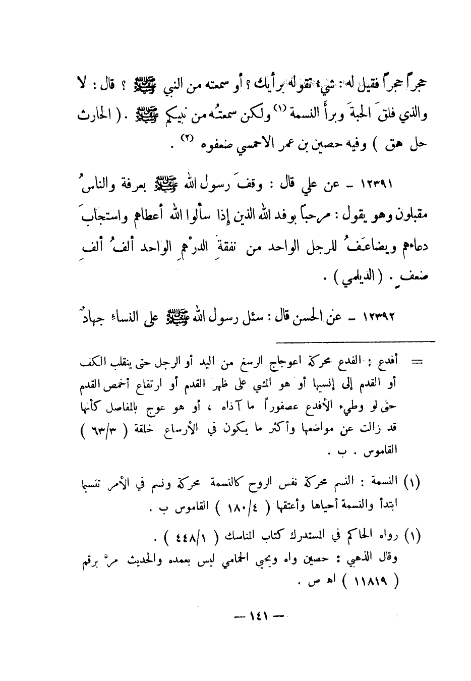 حجرا حجرا فقيل له: شيء تقوله برأيك؟ أو سمعته من النبي صلى الله عليه وسلم؟ قال: لا والذي فلق الحبة وبرأ النسمة1 ولكن سمعته من نبيكم صلى الله عليه وسلم. "الحارث حل هق" وفيه حصين بن عمر الأحمسي ضعفوه2