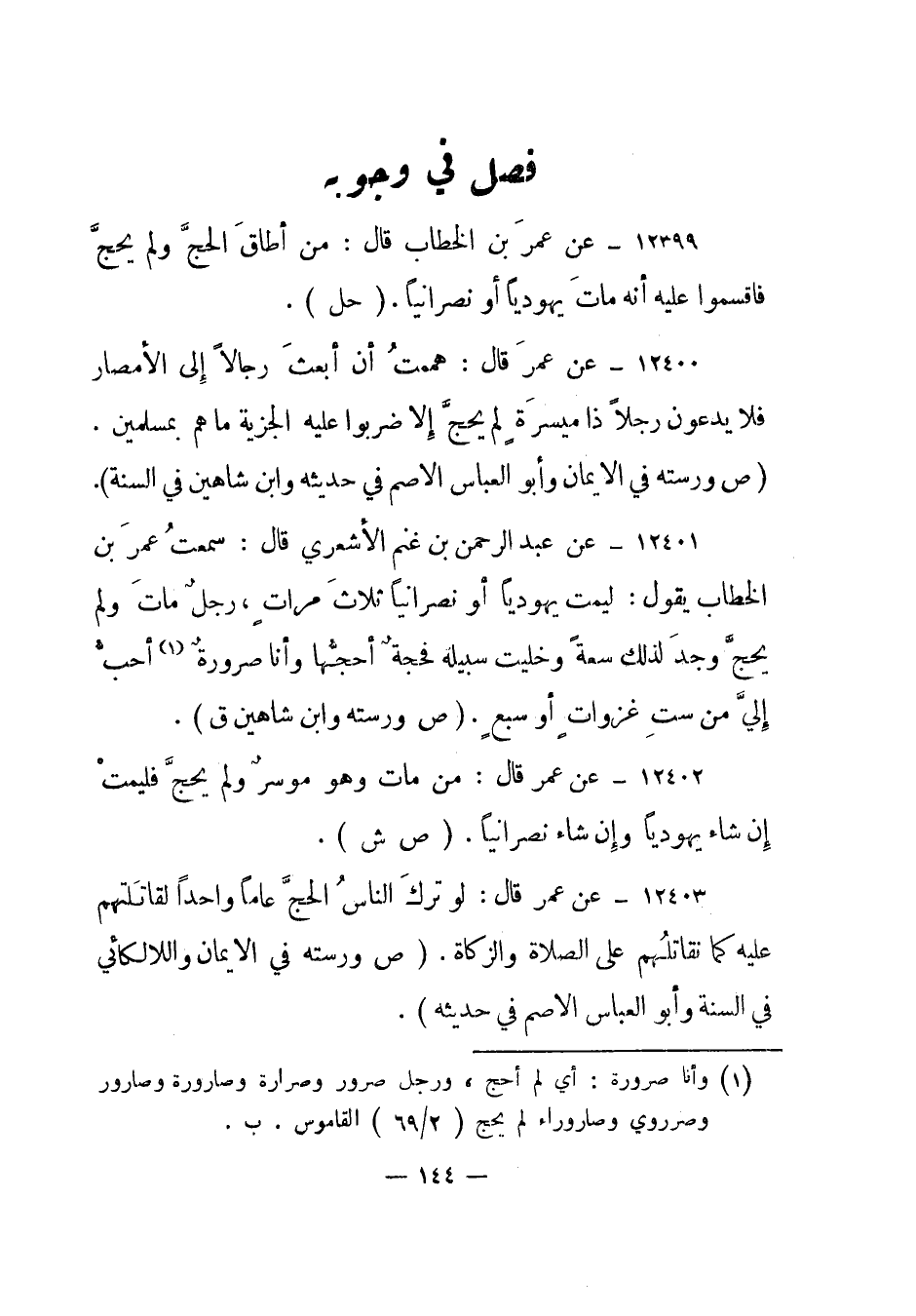 12403- عن عمر قال: لو ترك الناس الحج عاما واحدا لقاتلتهم عليه كما نقاتلهم على الصلاة والزكاة. "ص ورسته في الإيمان واللالكائي في السنة وأبو العباس الأصم في حديثه".