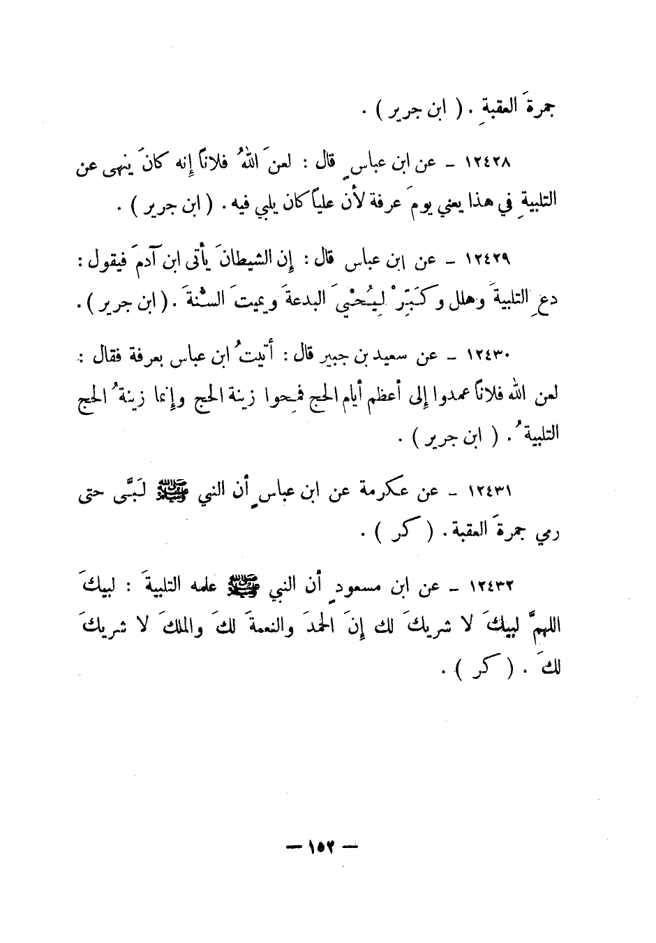 12428- عن ابن عباس قال: لعن الله فلانا إنه كان ينهى عن التلبية في هذا يعني يوم عرفة لأن عليا كان يلبي فيه. "ابن جرير".