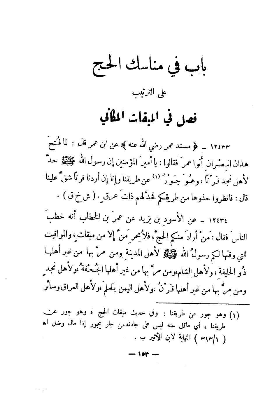12433- "مسند عمر رضي الله عنه" عن ابن عمر قال: لما فتح هذان المصران أتوا عمر فقالوا: يا أمير المؤمنين إن رسول الله صلى الله عليه وسلم حد لأهل نجد قرنا، وهو جور1 عن طريقنا وإنا إن أردنا قرنا شق علينا قال: فانظروا حذوها من طريقكم فحد لهم ذات عرق. "ش خ ق".
