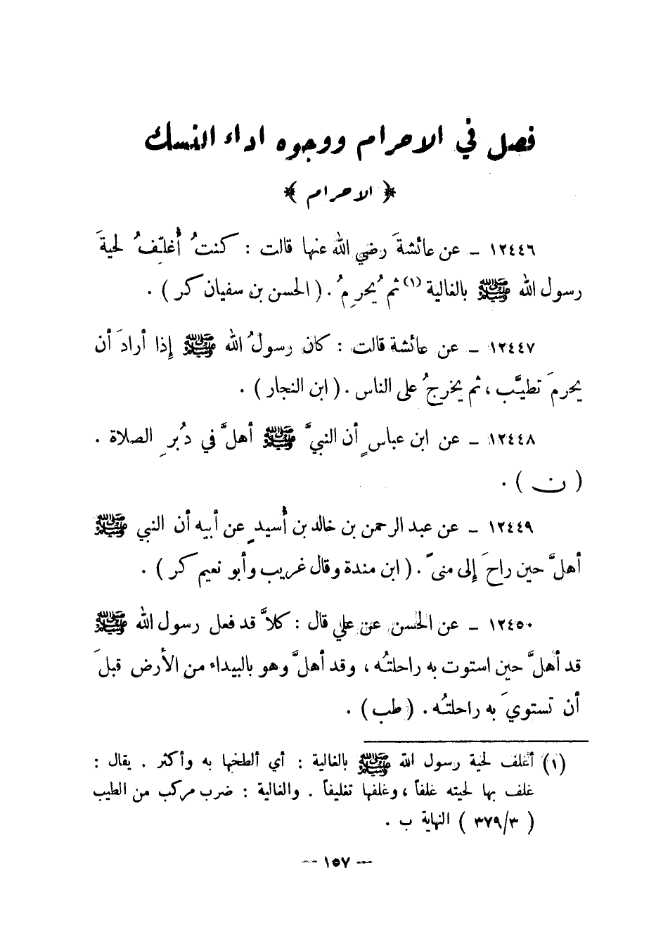 12447- عن عائشة قالت: كان رسول الله صلى الله عليه وسلم إذا أراد أن يحرم تطيب، ثم يخرج على الناس. "ابن النجار".