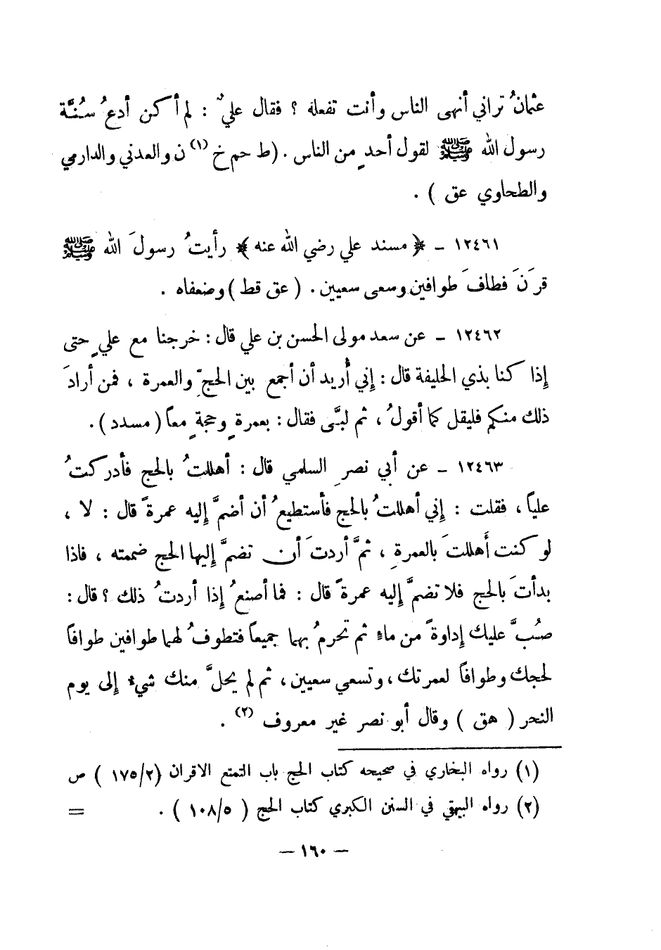12463- عن أبي نصر السلمي قال: أهللت بالحج فأدركت عليا، فقلت: إني أهللت بالحج فأستطيع أن أضم إليه عمرة قال: لا، لو كنت أهللت بالعمرة، ثم أردت أن تضم إليها الحج ضممته، فإذا بدأت بالحج فلا تضم إليه عمرة قال: فما أصنع إذا أردت ذلك؟ قال: صب عليك إداوة من ماء ثم تحرم بهما جميعا فتطوف لهما طوافين طوافا لحجك وطوافا لعمرتك، وتسعي سعيين، ثم لم يحل منك شيء إلى يوم النحر. "هق" وقال أبو نصر غير معروف2