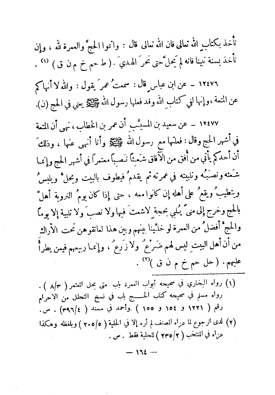 12477- عن سعيد بن المسيب أن عمر بن الخطاب، نهى أن المتعة في أشهر الحج وقال: فعلتها مع رسول الله صلى الله عليه وسلم وأنا أنهى عنها، وذلك أن أحدكم يأتي من أفق من الآفاق شعثا نصبا معتمرا في أشهر الحج وإنما شعثه ونصبه وتلبيته في عمرته ثم يقدم فيطوف بالبيت ويحل ويلبس ويتطيب ويقع على أهله إن كانوا معه، حتى إذا كان يوم التروية أهل بالحج وخرج إلى منى يلبي بحجة لا شعث فيها ولا نصب ولا تلبية إلا يوما والحج أفضل من العمرة لو خلينا بينهم وبين هذا لعانقوهن تحت الأراك من أن أهل البيت ليس لهم ضرع ولا زرع، وإنما ربيعهم فيمن يطرأ عليهم " حل حم خ م ن ق"2