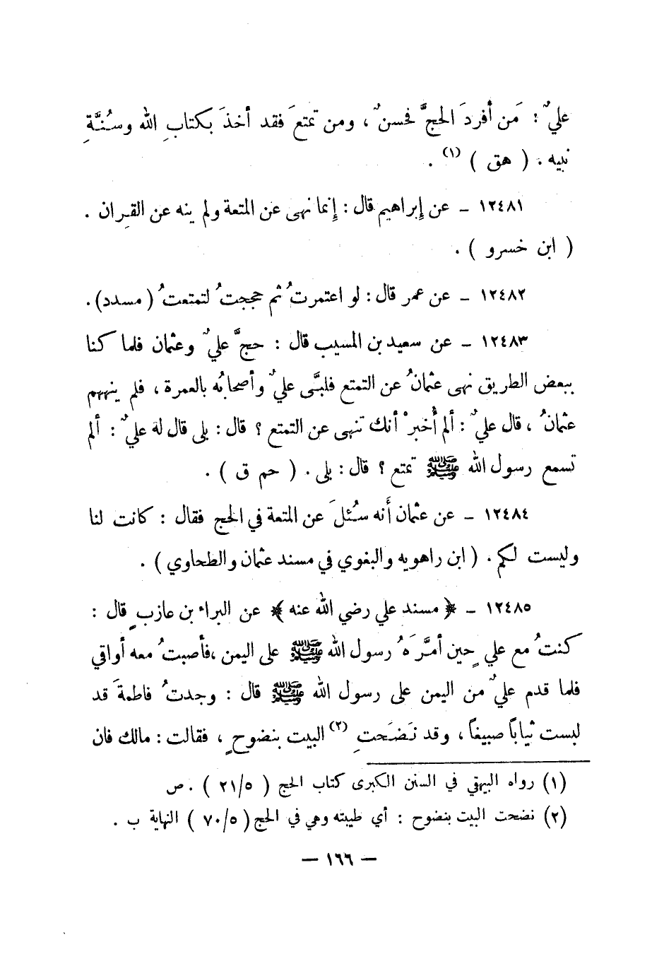 12484- عن عثمان أنه سئل عن المتعة في الحج فقال: كانت لنا وليست لكم. "ابن راهويه والبغوي في مسند عثمان والطحاوي".