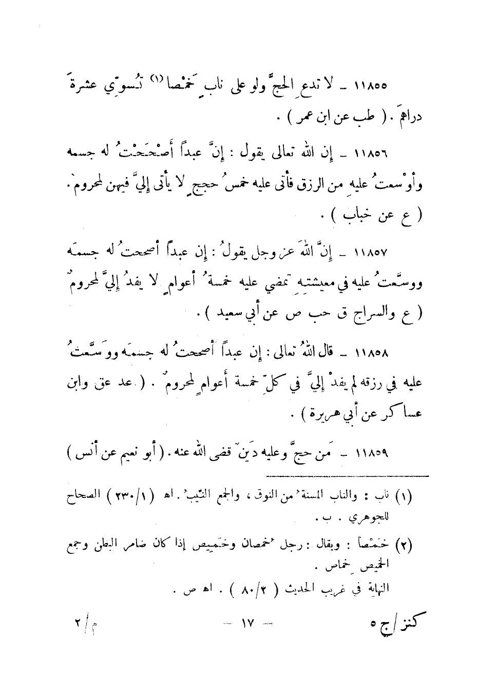 11855- لا تدع الحج ولو على ناب خمصا1 تسوي عشرة دراهم. "طب عن ابن عمر".