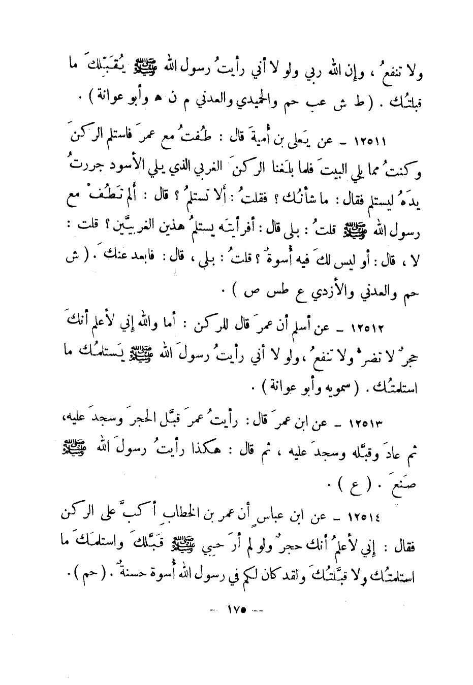 12514- عن ابن عباس أن عمر بن الخطاب أكب على الركن فقال: إني لأعلم أنك حجر ولو لم أر حبي صلى الله عليه وسلم قبلك واستلمك ما استلمتك ولا قبلتك ولقد كان لكم في رسول الله أسوة حسنة. "حم".