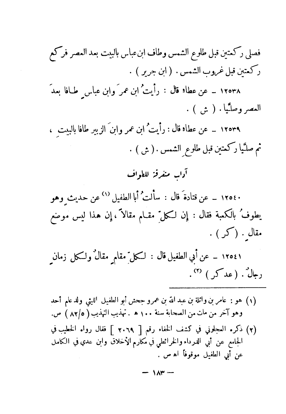 12540- عن قتادة قال: سألت أبا الطفيل1 عن حديث وهو يطوف بالكعبة فقال: إن لكل مقام مقالا، إن هذا ليس موضع مقال. "كر".