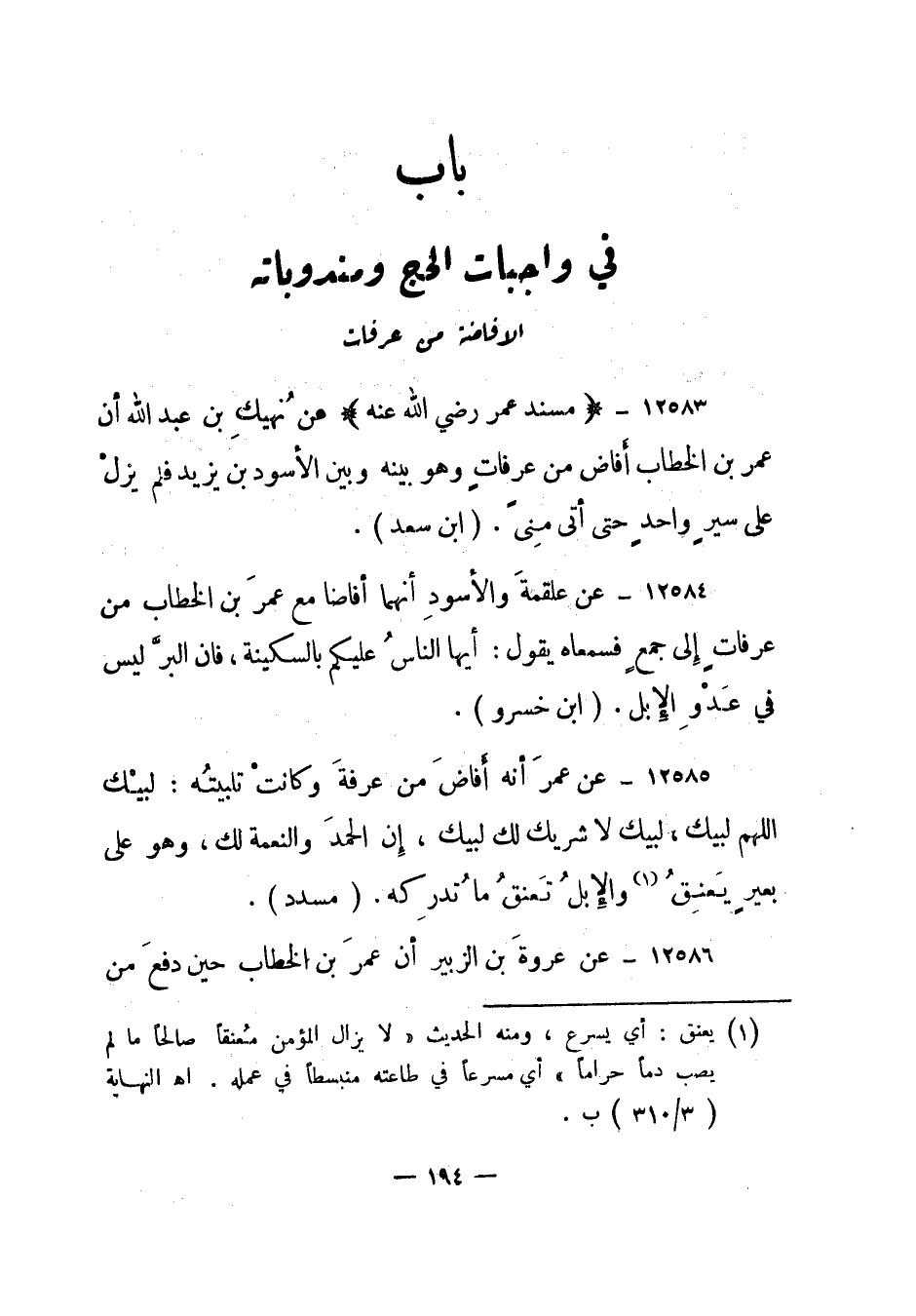 12585- عن عمر أنه أفاض من عرفة وكانت تلبيته: لبيك اللهم لبيك، لبيك لا شريك لك لبيك، إن الحمد والنعمة لك، وهو على بعير يعنق1 والإبل تعنق ما تدركه. "مسدد".
