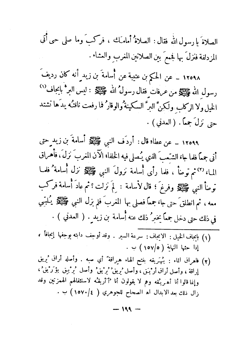 12599- عن عطاء قال: أردف النبي صلى الله عليه وسلم أسامة بن زيد حتى أتى جمعا فلما جاء الشعب الذي يصلى فيه الخلفاء الآن المغرب نزل، فأهراق الماء2 ثم توضأ، فلما رأى أسامة نزول النبي صلى الله عليه وسلم نزل أسامة فلما توضأ النبي صلى الله عليه وسلم وفرغ؛ قال لأسامة: لم نزلت؟ ثم عاد أسامة فركب معه، ثم انطلق حتى جاء جمعا فصلى بها المغرب فلم يزل النبي صلى الله عليه وسلم يلبي في ذلك حتى دخل جمعا يخبر ذلك عنه أسامة بن زيد. "العدني".