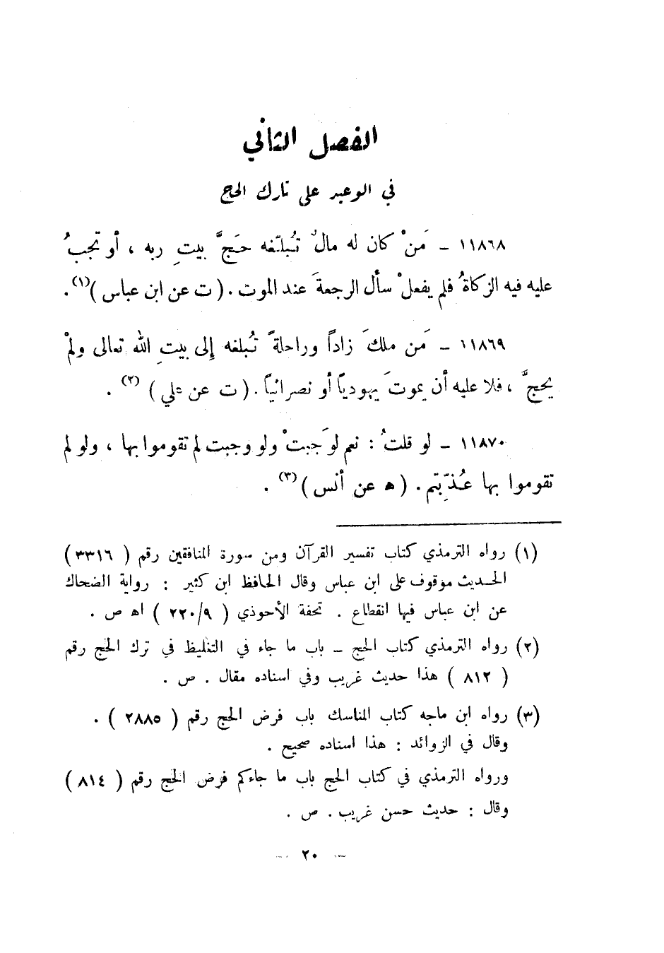 2 رواه الترمذي كتاب الحج - باب ما جاء في التغليظ في ترك الحج رقم "812" هذا حديث غريب وفي إسناده مقال. ص.