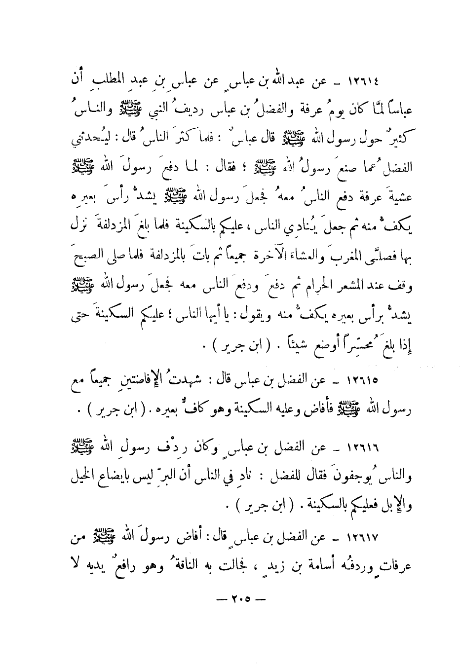 12615- عن الفضل بن عباس قال: شهدت الإفاضتين جميعا مع رسول الله صلى الله عليه وسلم فأفاض وعليه السكينة وهو كاف بعيره. "ابن جرير".
