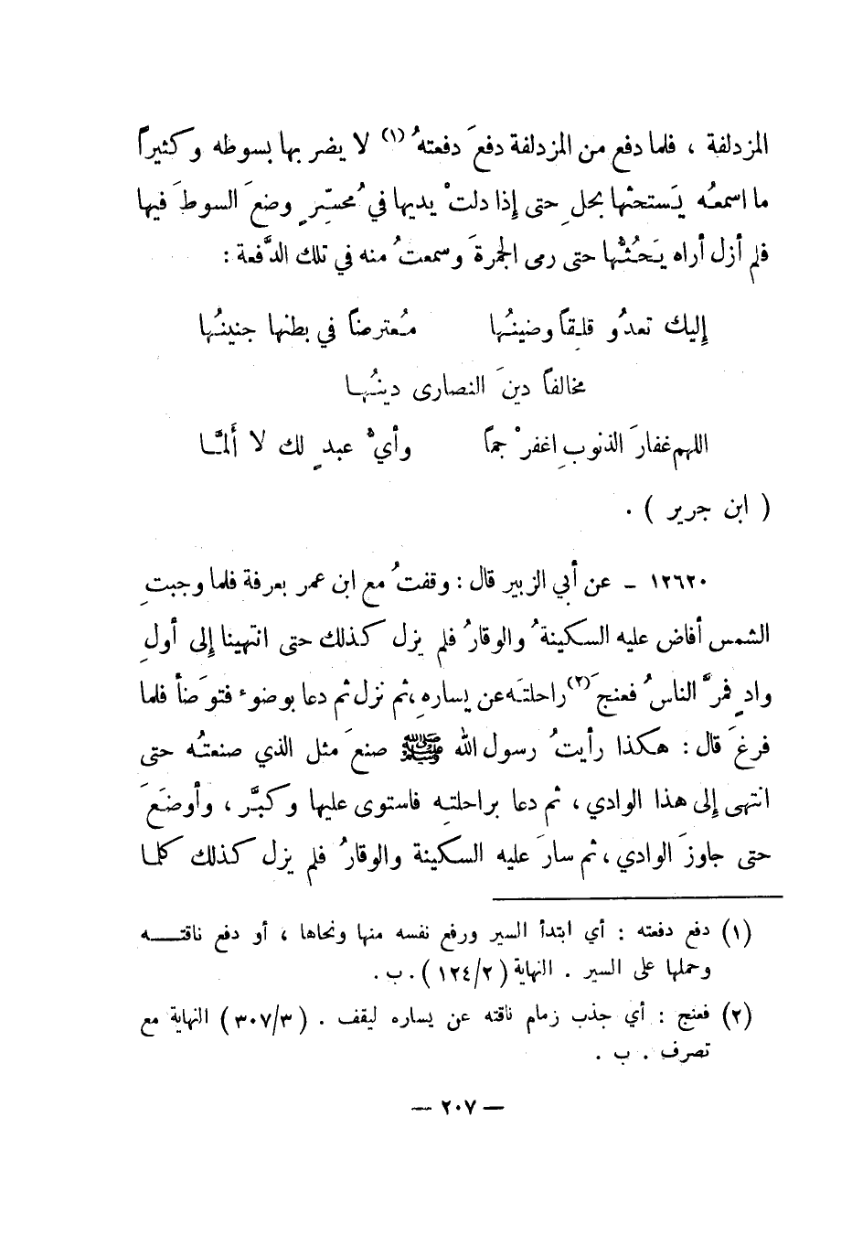 12620- عن أبي الزبير قال: وقفت مع ابن عمر بعرفة فلما وجبت الشمس أفاض عليه السكينة والوقار فلم يزل كذلك حتى انتهينا إلى أول واد فمر الناس فعنج2 راحلته عن يساره، ثم نزل ثم دعا بوضوء فتوضأ فلما فرغ قال: هكذا رأيت رسول الله صلى الله عليه وسلم صنع مثل الذي صنعته حتى انتهى إلى هذا الوادي، ثم دعا براحلته فاستوى عليها وكبر، وأوضع حتى جاوز الوادي، ثم سار عليه السكينة والوقار فلم يزل كذلك كلما