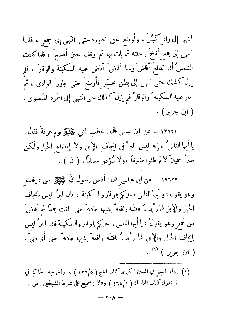 12622- عن ابن عباس قال: أفاض رسول الله صلى الله عليه وسلم من عرفات وهو يقول: يا أيها الناس، عليكم بالوقار والسكينة، فإن البر ليس بإيجاف الخيل والإبل فما رأيت ناقته رافعة يديها عادية حتى بلغت جمعا ثم أفاض من جمع وهو يقول: يا أيها الناس، عليكم بالوقار والسكينة فإن البر ليس بإيجاف الخيل والإبل فما رأيت ناقته رافعة يديها عادية حتى أتى منى. "ابن جرير"1