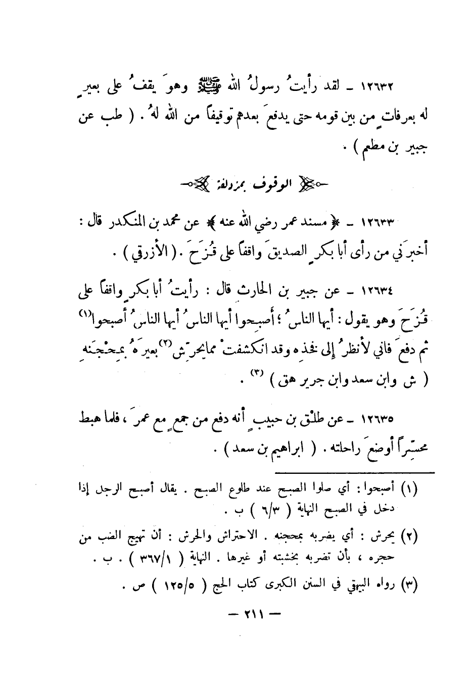 12633- "مسند عمر رضي الله عنه" عن محمد بن المنكدر قال: أخبرني من رأى أبا بكر الصديق واقفا على قزح. "الأزرقي".