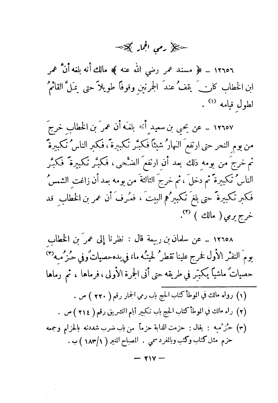 1 رواه مالك في الموطأ كتاب الحج باب رمي الجمار رقم "220" ص.