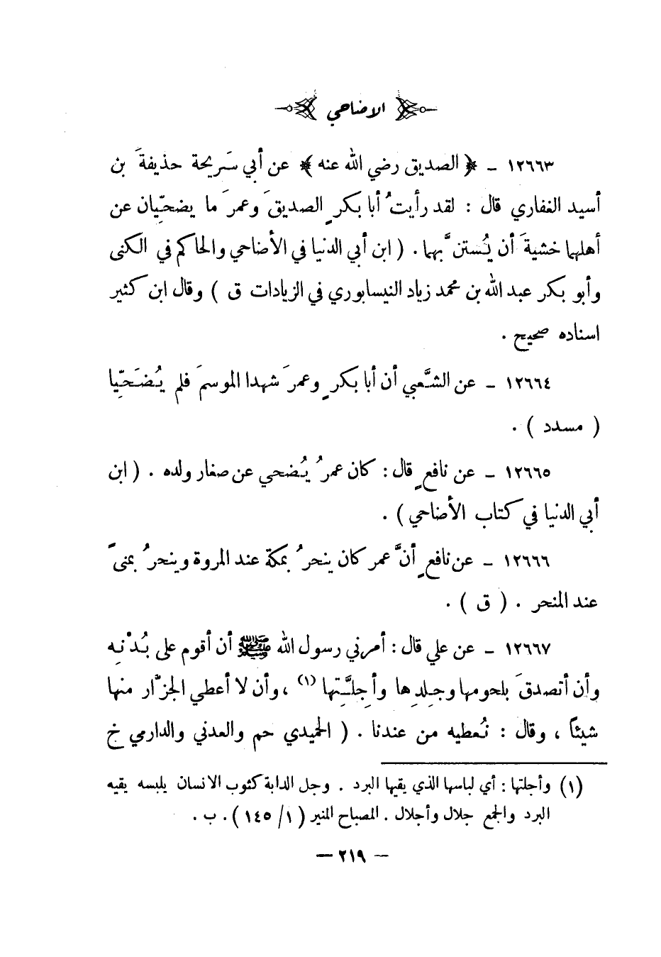 12663- "الصديق رضي الله عنه" عن أبي سريحة حذيفة بن أسيد الغفاري قال: لقد رأيت أبا بكر الصديق وعمر ما يضحيان عن أهلهما خشية أن يستن بهما. "ابن أبي الدنيا في الأضاحي والحاكم في الكنى وأبو بكر عبد الله بن محمد زياد النيسابوري في الزيادات ق" وقال ابن كثير إسناده صحيح.
