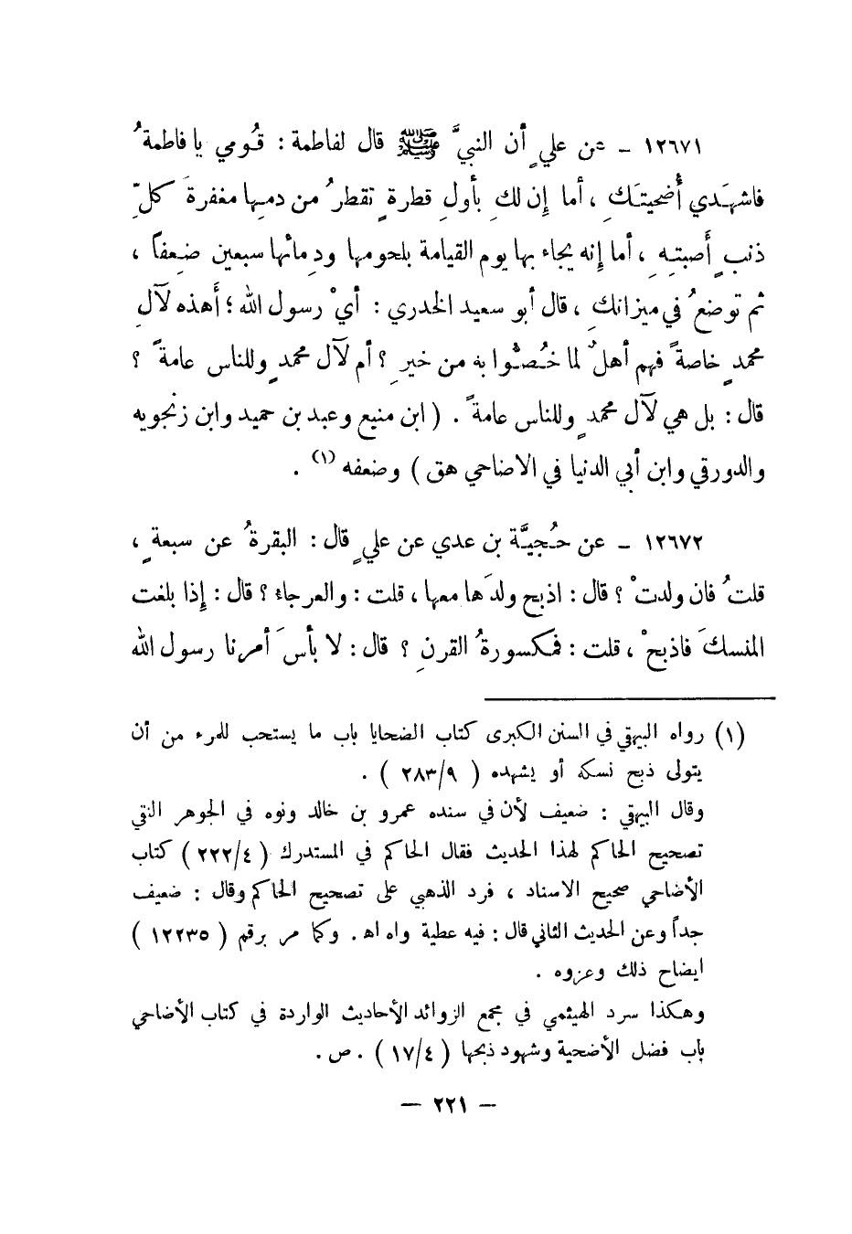 وهكذا سرد الهيثمي في مجمع الزوائد الأحاديث الواردة في كتاب الأضاحي باب فضل الأضحية وشهود ذبحها "4/17". ص.