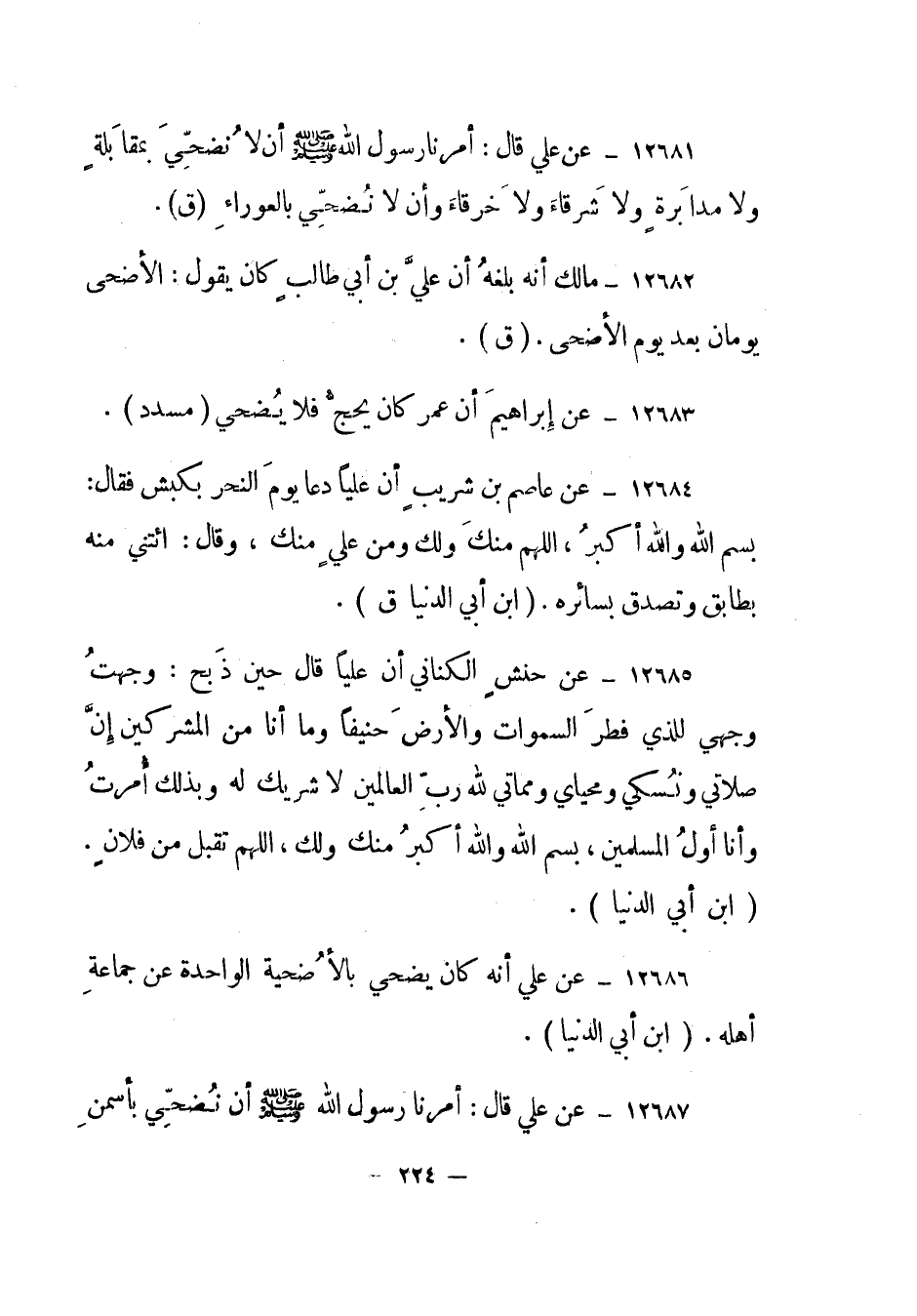 12686- عن علي أنه كان يضحي بالأضحية الواحدة عن جماعة أهله. "ابن أبي الدنيا".