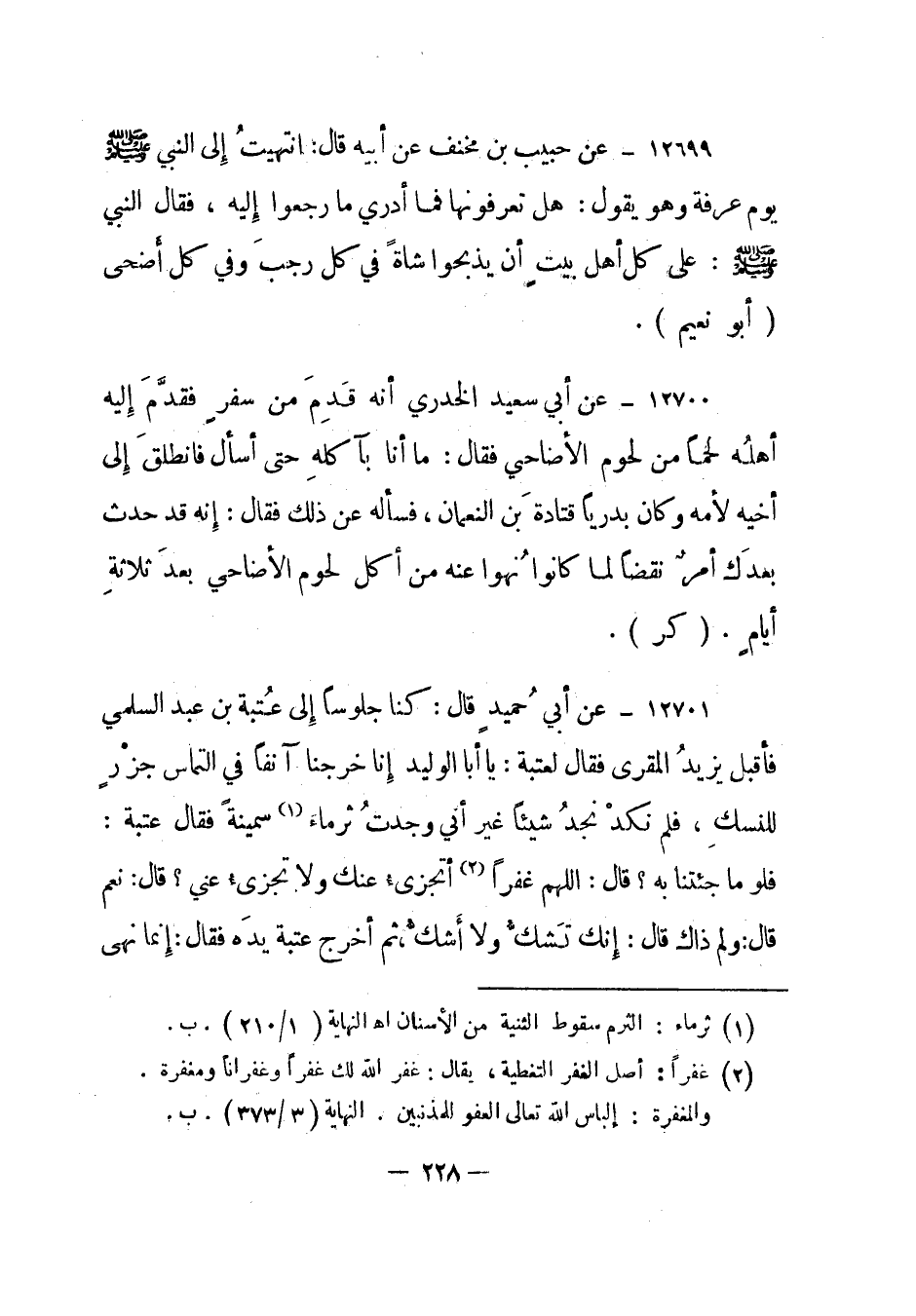 12699- عن حبيب بن مخنف عن أبيه قال: انتهيت إلى النبي صلى الله عليه وسلم يوم عرفة وهو يقول: هل تعرفونها فما أدري ما رجعوا إليه، فقال النبي صلى الله عليه وسلم: على كل أهل بيت أن يذبحوا شاة في كل رجب وفي كل أضحى. "أبو نعيم".
