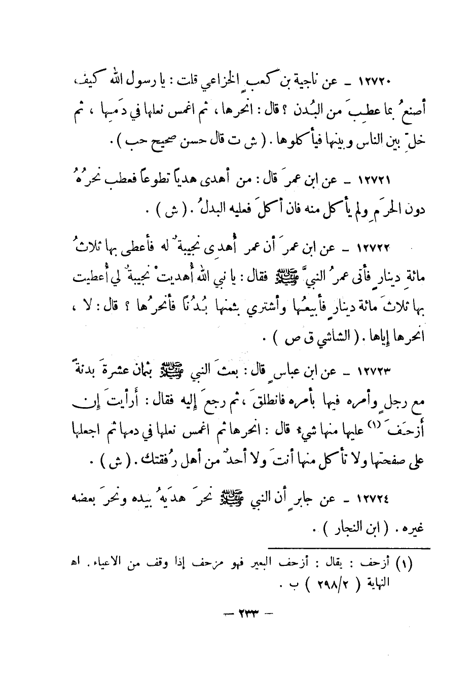 12722- عن ابن عمر أن عمر أهدى نجيبة له فأعطى بها ثلاث مائة دينار فأتى عمر النبي صلى الله عليه وسلم فقال: يا نبي الله أهديت نجيبة لي أعطيت بها ثلاث مائة دينار فأبيعها وأشتري بثمنهلا بدنا فأنحرها؟ قال: لا، انحرها إياها. "الشاشي ق ص".