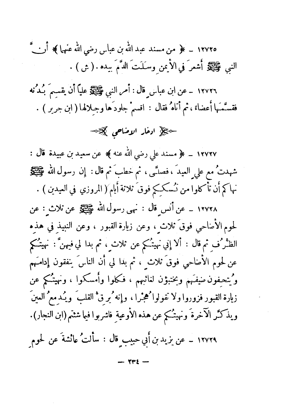 12725- "من مسند عبد الله بن عباس رضي الله عنهما" أن النبي صلى الله عليه وسلم أشعر في الأيمن وسلت الدم بيده. "ش".
