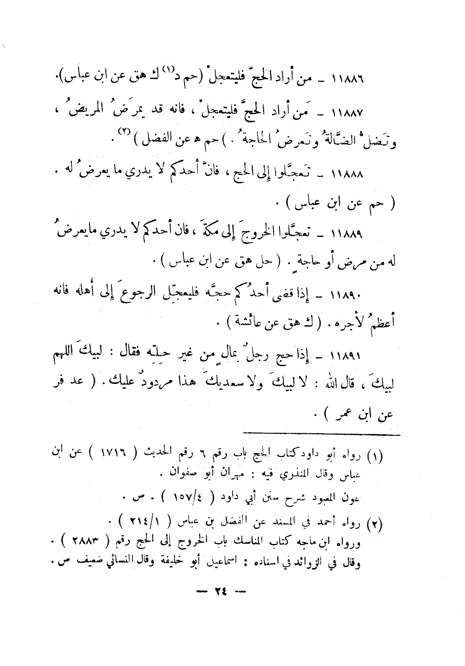 11887- من أراد الحج فليتعجل، فإنه قد يمرض المريض، وتضل الضالة وتعرض الحاجة. "حم هـ عن الفضل"2