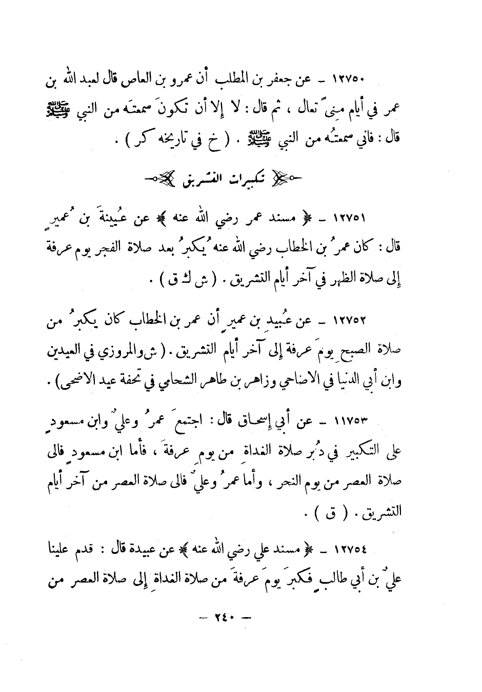 12751- "مسند عمر رضي الله عنه" عن عيينة بن عمير قال: كان عمر بن الخطاب رضي الله عنه يكبر بعد صلاة الفجر يوم عرفة إلى صلاة الظهر في آخر أيام التشريق. "ش ك ق".