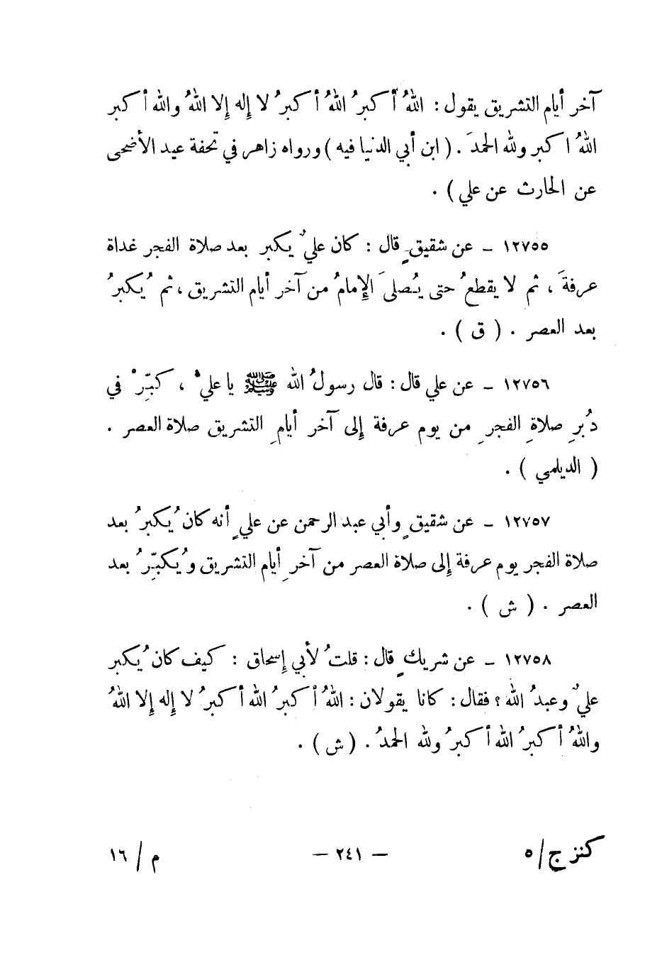 12757- عن شقيق وأبي عبد الرحمن عن علي أنه كان يكبر بعد صلاة الفجر يوم عرفة إلى صلاة العصر من آخر أيام التشريق ويكبر بعد العصر. "ش".