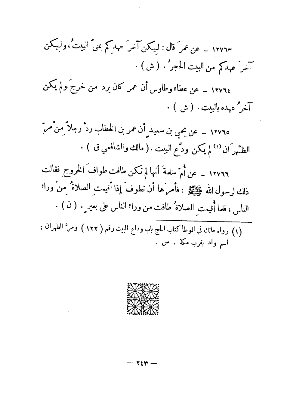 1 رواه مالك في الموطأ كتاب الحج باب وداع البيت رقم "122" ومر الظهران: اسم واد بقرب مكة. ص.