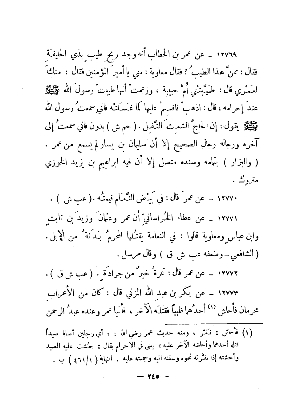 12771- عن عطاء الخراساني أن عمر وعثمان وزيد بن ثابت وابن عباس ومعاوية قالوا: في النعامة يقتلها المحرم بدنة من الإبل. "الشافعي - وضعفه عب ش ق" وقال مرسل.