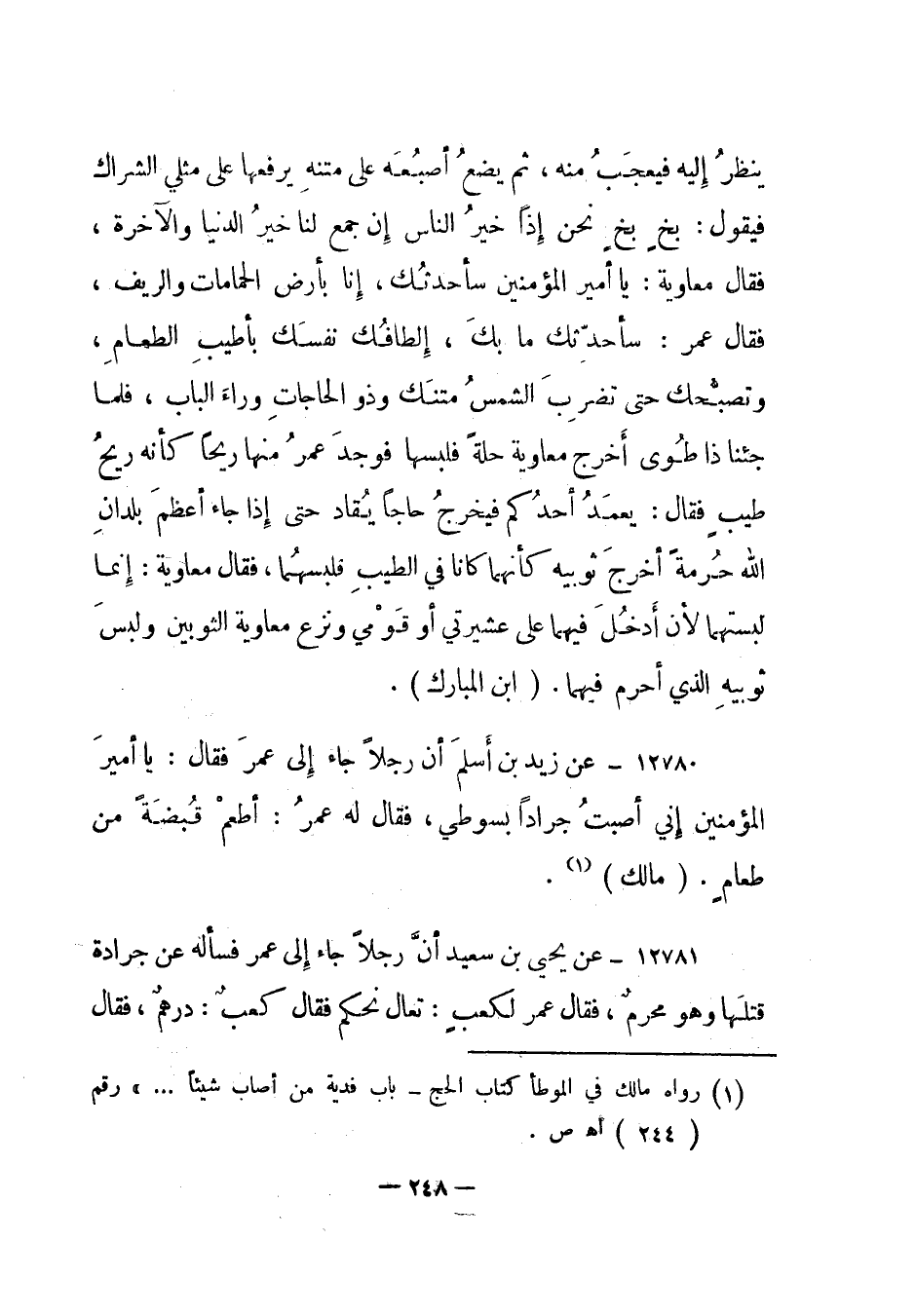 12780- عن زيد بن أسلم أن رجلا جاء إلى عمر فقال: يا أمير المؤمنين إني أصبت جرادا بسوطي، فقال له عمر: أطعم قبضة من طعام. "مالك"1