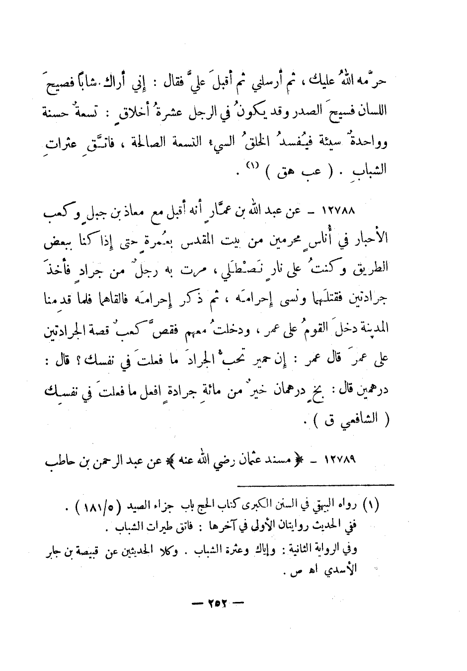 12788- عن عبد الله بن عمار أنه أقبل مع معاذ بن جبل وكعب الأحبار في أناس محرمين من بيت المقدس بعمرة حتى إذا كنا ببعض الطريق وكنت على نار نصطلي، مرت به رجل من جراد فأخذ جرادتين فقتلهما ونسى إحرامه، ثم ذكر إحرامه فألقاهما فلما قدمنا المدينة دخل القوم على عمر، ودخلت معهم فقص كعب قصة الجرادتين على عمر قال عمر: إن حمير تحب الجراد ما فعلت في نفسك؟ قال: درهمين قال: بخ درهمان خير من مائة جرادة افعل ما فعلت في نفسك. "الشافعي ق".