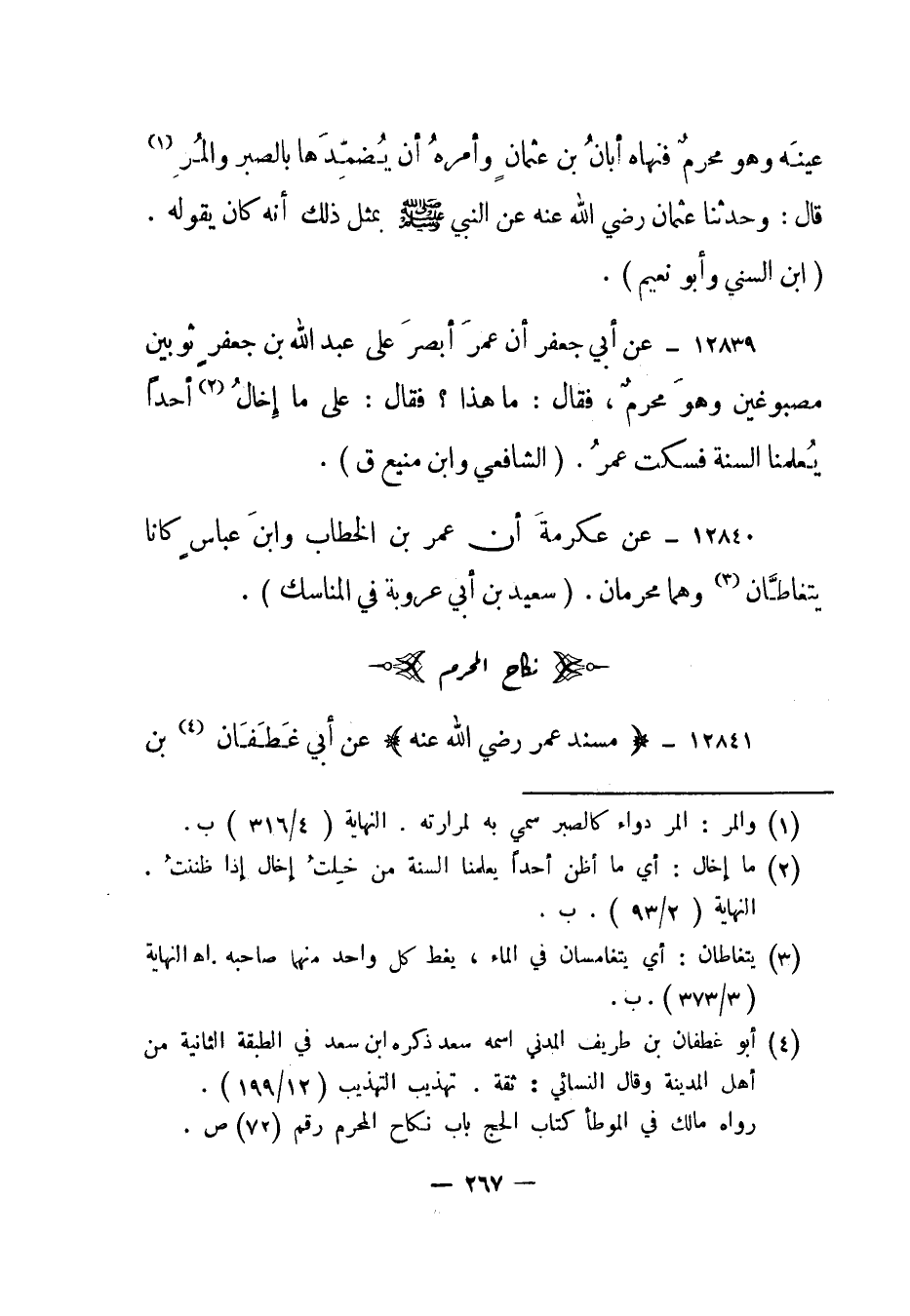 عينه وهو محرم فنهاه أبان بن عثمان وأمره أن يضمدها بالصبر والمر1 قال: وحدثنا عثمان رضي الله عنه عن النبي صلى الله عليه وسلم بمثل ذلك أنه كان يقوله. "ابن السني وأبو نعيم".