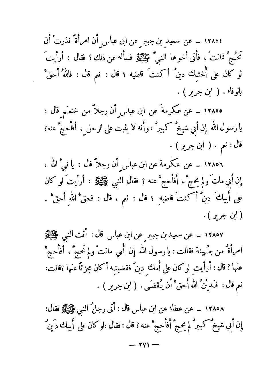 12857- عن سعيد بن جبير عن ابن عباس قال: أتت النبي صلى الله عليه وسلم امرأة من جهينة فقالت: يا رسول الله إن أمي ماتت ولم تحج، أفأحج عنها؟ قال: أرأيت لو كان على أمك دين فقضيته أكان مجزئا عنها؟ قالت: نعم قال: فدين الله أحق أن يقضى. "ابن جرير".