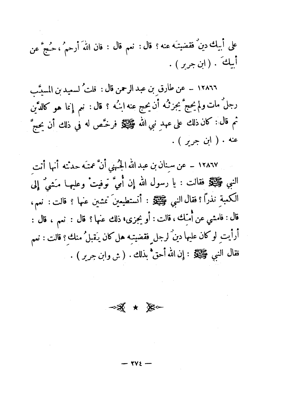 12867- عن سنان بن عبد الله الجهني أن عمته حدثته أنها أتت النبي صلى الله عليه وسلم فقالت: يا رسول الله إن أمي توفيت وعليها مشي إلى الكعبة نذرا؟ فقال النبي صلى الله عليه وسلم: أتستطيعين تمشين عنها؟ قالت: نعم، قال: فامشي عن أمك، قالت: أو يجزئ ذلك عنها؟ قال: نعم، قال: أرأيت لو كان عليها دين لرجل فقضيته هل كان يقبل منك؟ قالت: نعم فقال النبي صلى الله عليه وسلم: إن الله أحق بذلك. "ش وابن جرير".