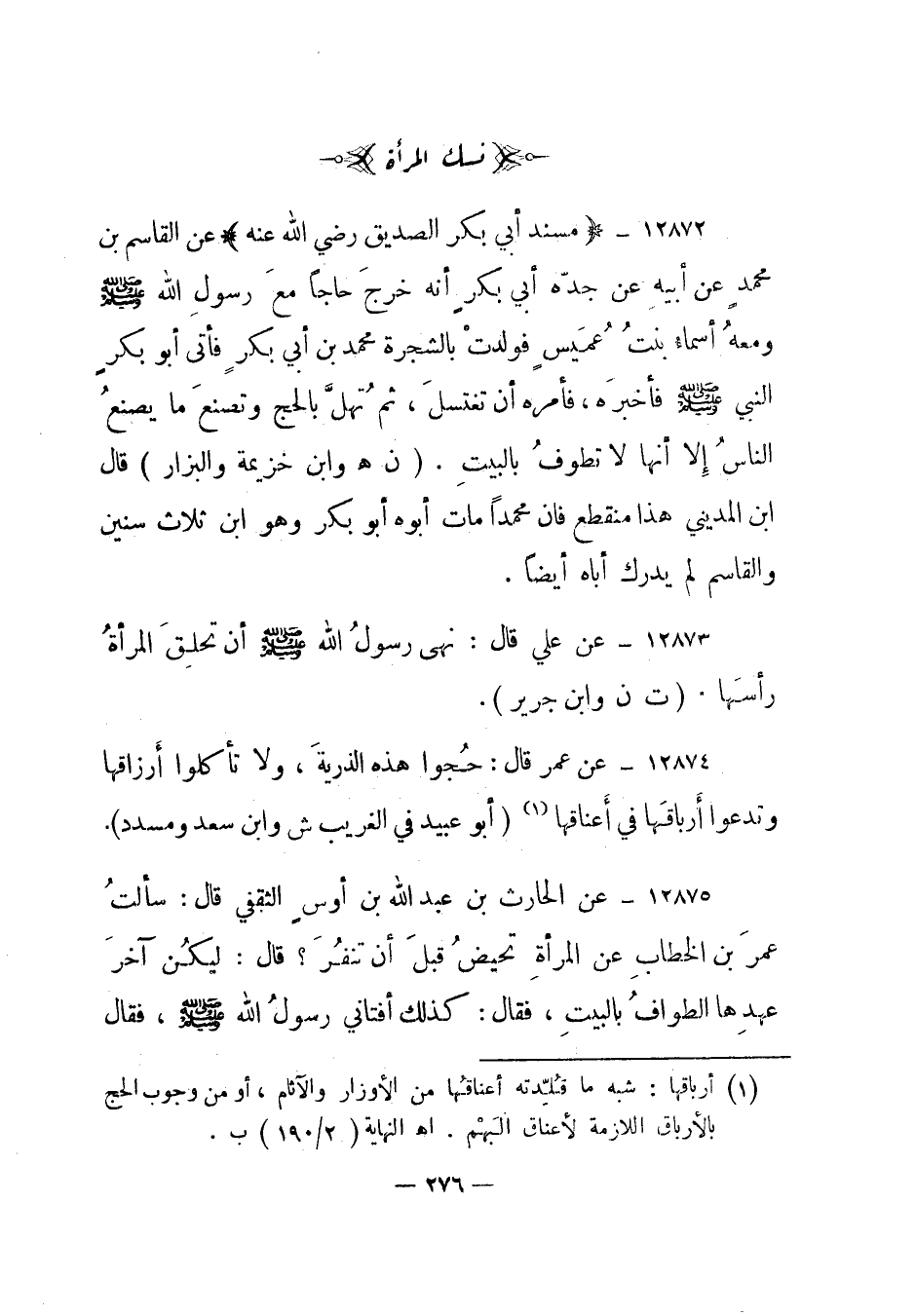 12875- عن الحارث بن عبد الله بن أوس الثقفي قال: سألت عمر بن الخطاب عن المرأة تحيض قبل أن تنفر؟ قال: ليكن آخر عهدها الطواف بالبيت، فقال: كذلك أفتاني رسول الله صلى الله عليه وسلم، فقال