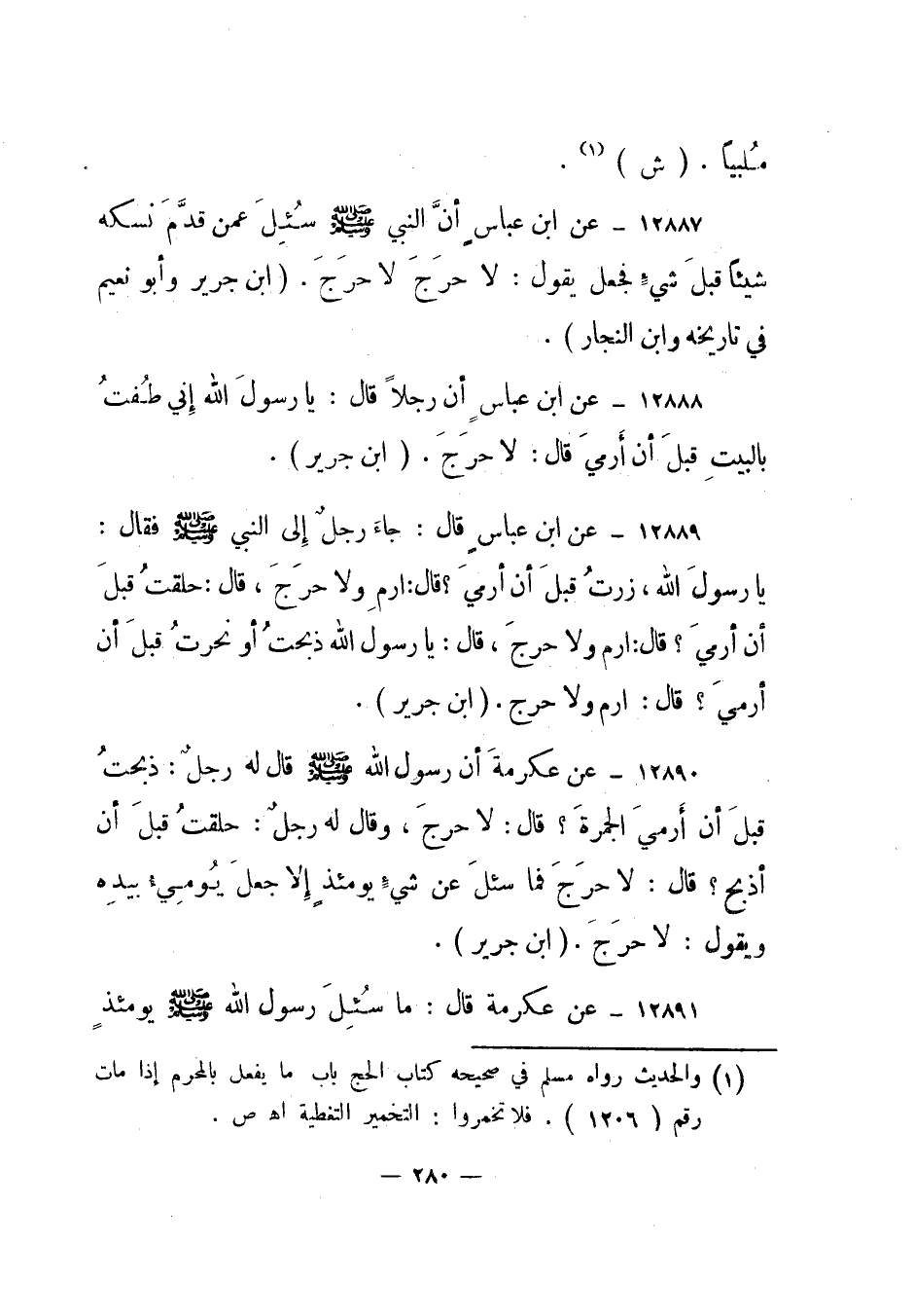 12887- عن ابن عباس أن النبي صلى الله عليه وسلم سئل عمن قدم نسكه شيئا قبل شيء فجعل يقول: لا حرج لا حرج. "ابن جرير وأبو نعيم في تاريخه وابن النجار".