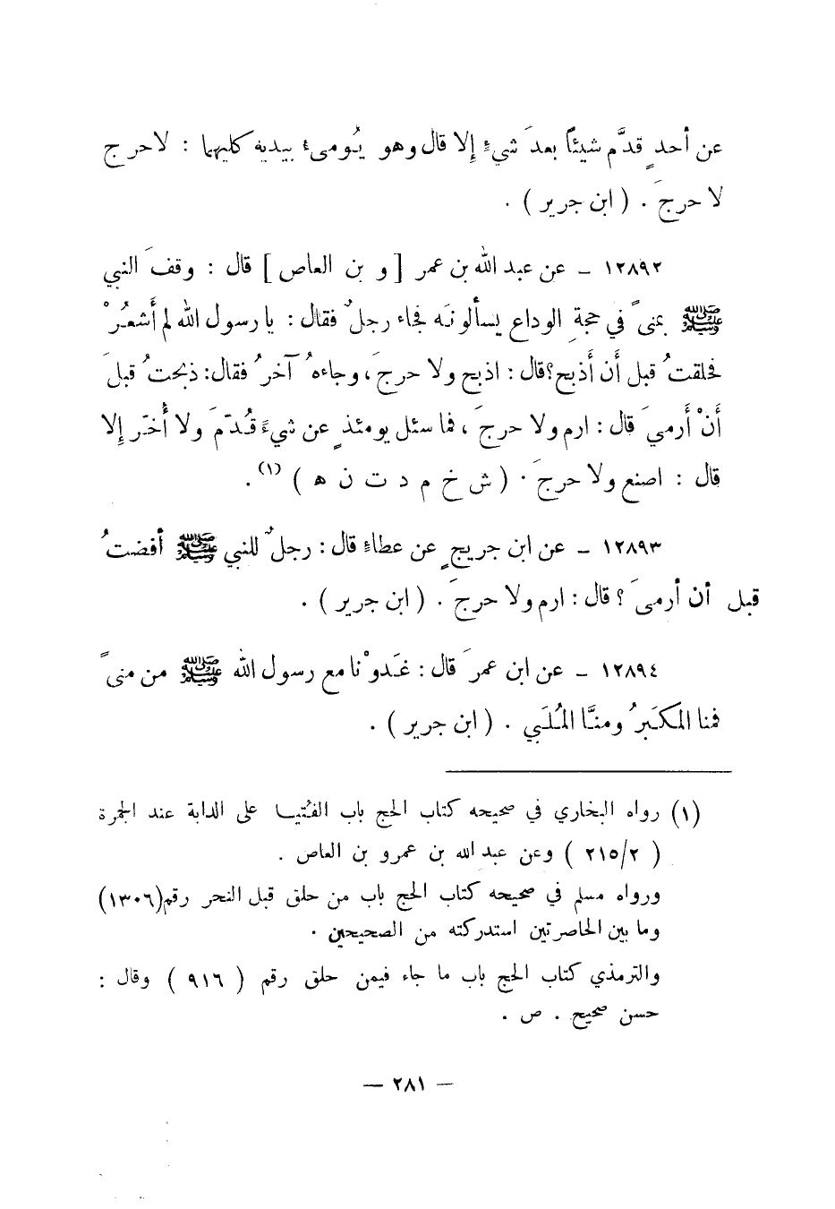 12892- عن عبد الله بن عمر [وبن العاص] قال: وقف النبي صلى الله عليه وسلم بمنى في حجة الوداع يسألونه فجاء رجل فقال: يا رسول الله لم أشعر فحلقت قبل أن أذبح؟ قال: اذبح ولا حرج، وجاءه آخر فقال: ذبحت قبل أن أرمي قال: ارم ولا حرج، فما سئل يومئذ عن شيء قدم ولا أخر إلا قال: اصنع ولا حرج. "ش خ م د ت ن هـ"1