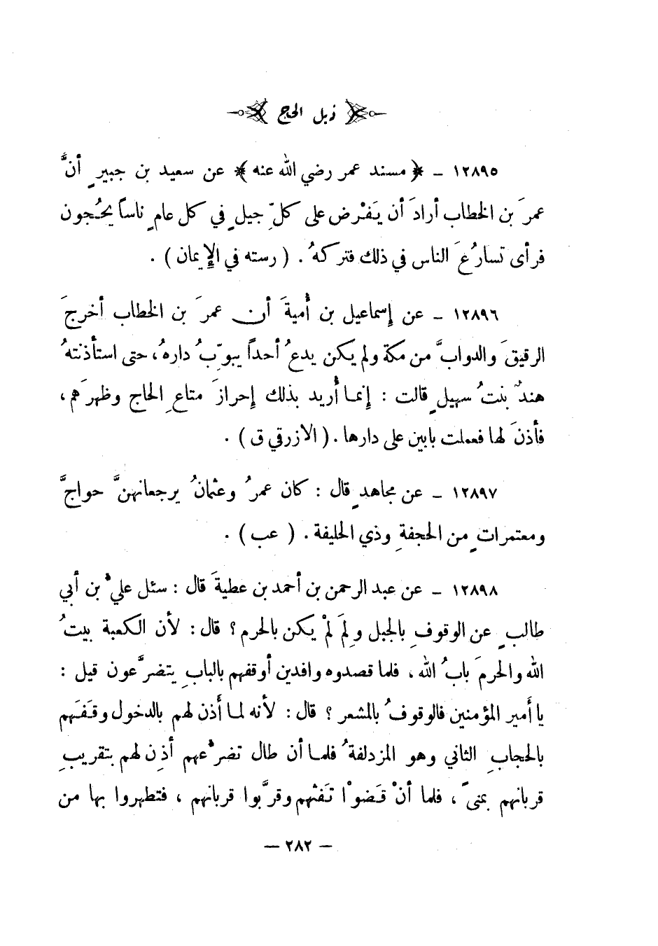 12895- "مسند عمر رضي الله عنه" عن سعيد بن جبير أن عمر بن الخطاب أراد أن يفرض على كل جيل في كل عام ناسا يحجون فرأى تسارع الناس في ذلك فتركه. "رسته في الإيمان".