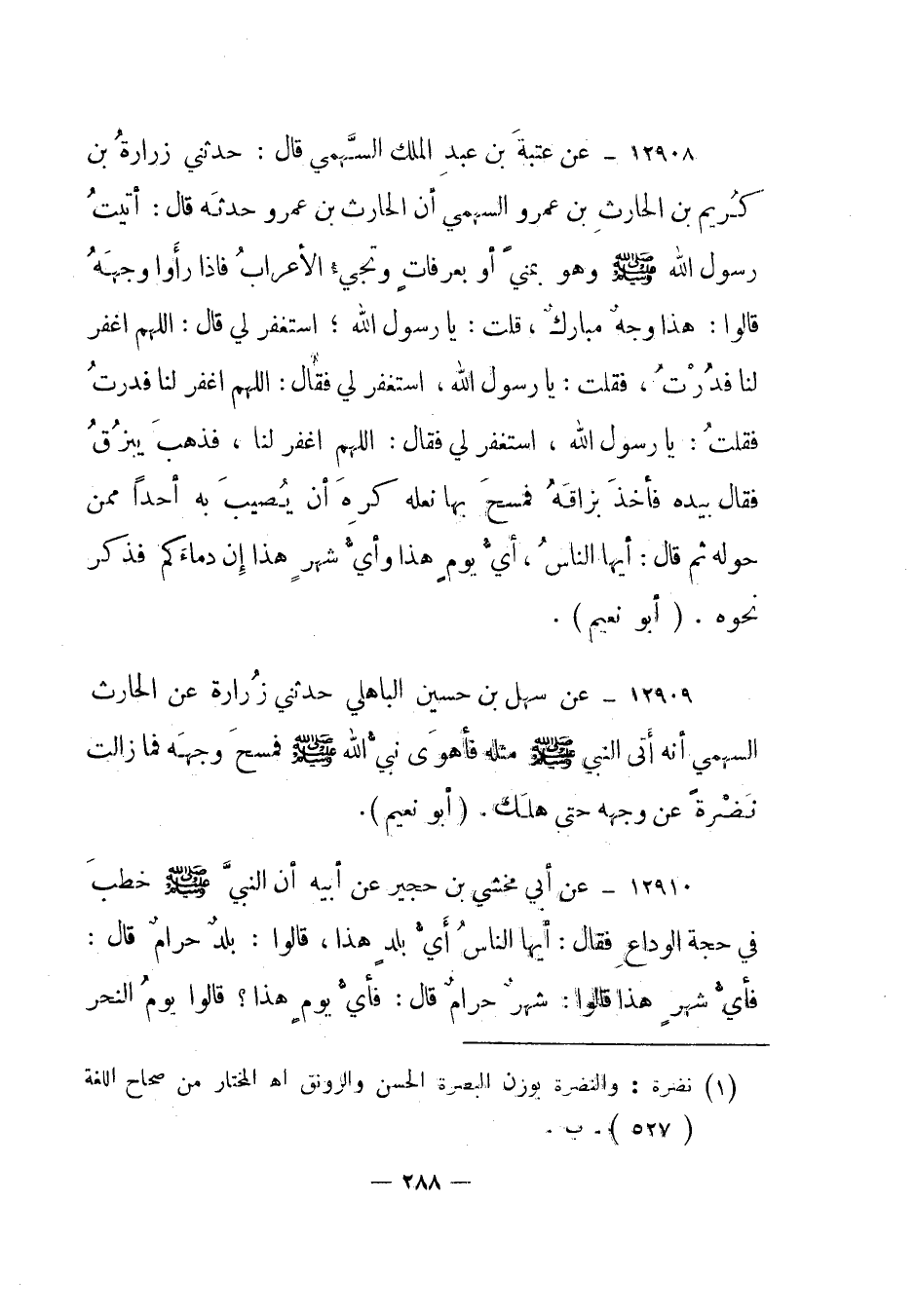 12908- عن عتبة بن عبد الملك السهمي قال: حدثني زرارة بن كريم بن الحارث بن عمرو السهمي أن الحارث بن عمرو حدثه قال: أتيت رسول الله صلى الله عليه وسلم وهو بمنى أو بعرفات وتجيء الأعراب فإذا رأوا وجهه قالوا: هذا وجه مبارك، قلت: يا رسول الله؛ استغفر لي قال: اللهم اغفر لنا فدرت، فقلت: يا رسول الله، استغفر لي فقال: اللهم اغفر لنا فدرت فقلت: يا رسول الله، استغفر لي فقال: اللهم اغفر لنا، فذهب يبزق فقال بيده فأخذ بزاقه فمسح بها نعله كره أن يصيب به أحدا ممن حوله ثم قال: أيها الناس، أي يوم هذا وأي شهر هذا إن دماءكم فذكر نحوه. "أبو نعيم".