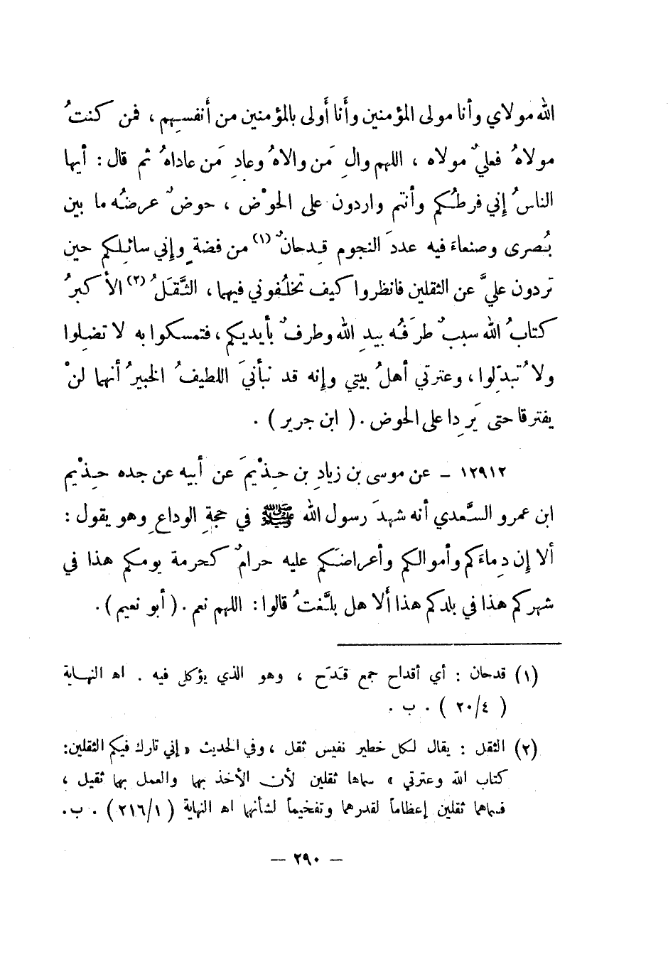 الله مولاي وأنا مولى المؤمنين وانا أولى بالمؤمنين من أنفسهم، فمن كنت مولاه فعلي مولاه، اللهم وال من والاه وعاد من عاداه ثم قال: أيها الناس إني فرطكم وأنتم واردون على الحوض، حوض عرضه ما بين بصرى وصنعاء فيه عدد النجوم قدحان1 من فضة وإني سائلكم حين تردون علي عن الثقلين فانظروا كيف تخلفوني فيهما، الثقل2 الأكبر كتاب الله سبب طرفه بيد الله وطرف بأيديكم، فتمسكوا به لا تضلوا ولا تبدلوا، وعترتي أهل بيتي وإنه قد نبأني اللطيف الخبير أنهما لن يفترقا حتى يردا على الحوض. "ابن جرير".