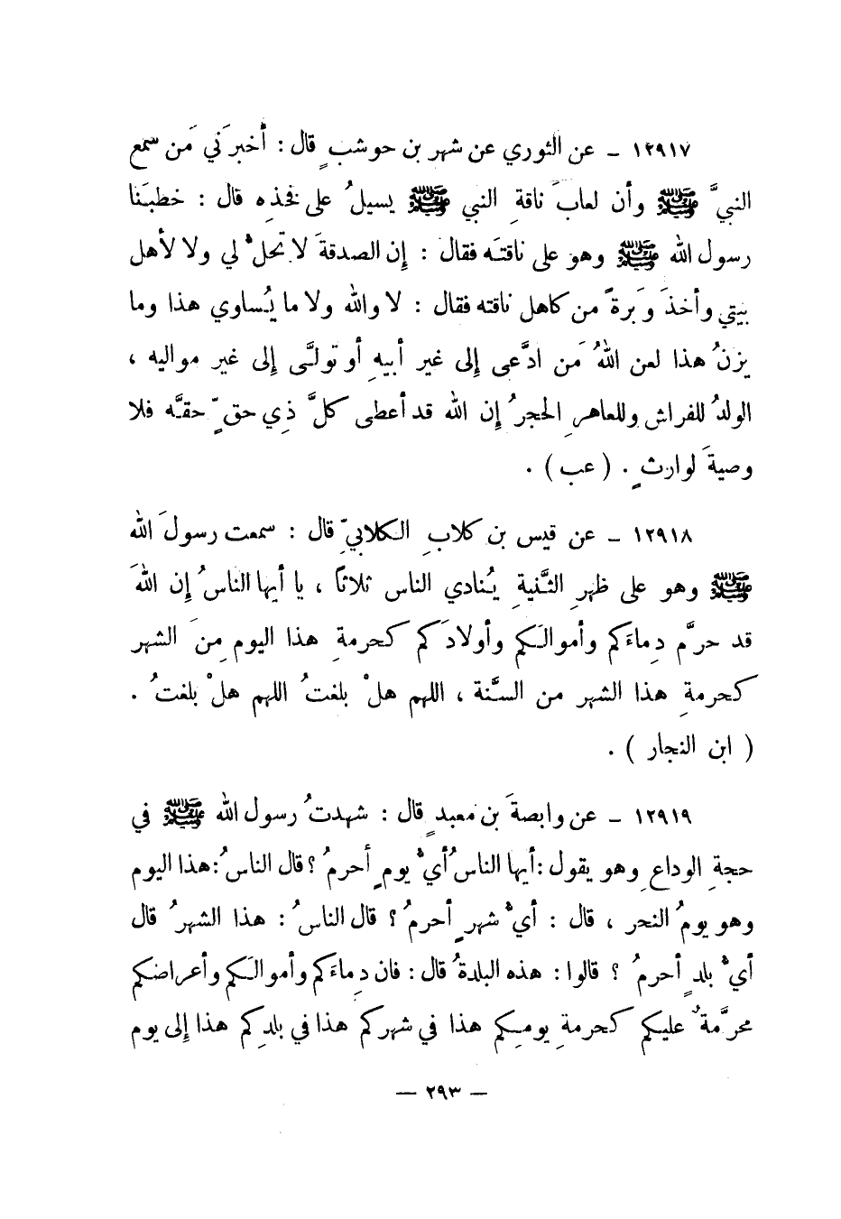 12918- عن قيس بن كلاب الكلابي قال: سمعت رسول الله صلى الله عليه وسلم وهو على ظهر الثنية ينادي الناس ثلاثا، يا ايها الناس إن الله قد حرم دماءكم وأموالكم وأولادكم كحرمة هذا اليوم من الشهر كحرمة هذا الشهر من السنة، اللهم هل بلغت اللهم هل بلغت. "ابن النجار".