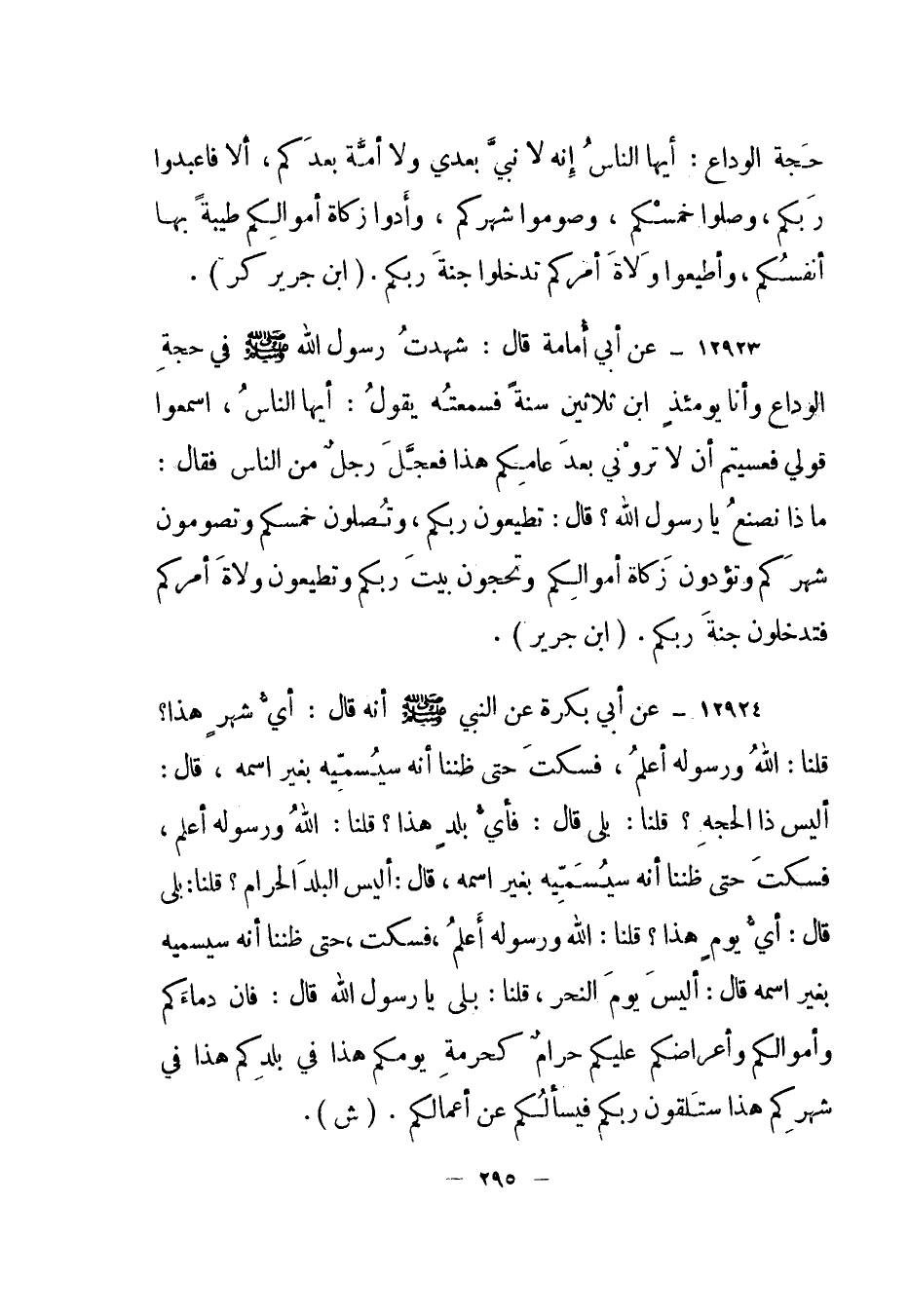 12924- عن أبي بكرة عن النبي صلى الله عليه وسلم أنه قال: أي شهر هذا؟ قلنا: الله ورسوله أعلم، فسكت حتى ظننا أنه سيسميه بغير اسمه، قال: أليس ذا الحجه؟ قلنا: بلى قال: فأي بلد هذا؟ قلنا: الله ورسوله أعلم، فسكت حتى ظننا أنه سيسميه بغير اسمه، قال: أليس البلد الحرام؟ قلنا: بلى قال: أي يوم هذا؟ قلنا: الله ورسوله أعلم، فسكت، حتى ظننا أنه سيسميه بغير اسمه قال: أليس يوم النحر، قلنا: بلى يا رسول الله قال: فإن دماءكم وأموالكم وأعراضكم عليكم حرام كحرمة يومكم هذا في بلدكم هذا في شهركم هذا ستلقون ربكم فيسألكم عن أعمالكم. "ش".