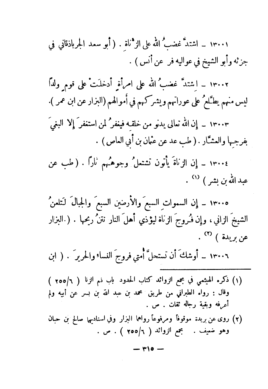 13005- إن السموات السبع والأرضين السبع والجبال لتلعن الشيخ الزاني، وإن فروج الزناة ليؤذي أهل النار نتن ريحها. "البزار عن بريدة"2