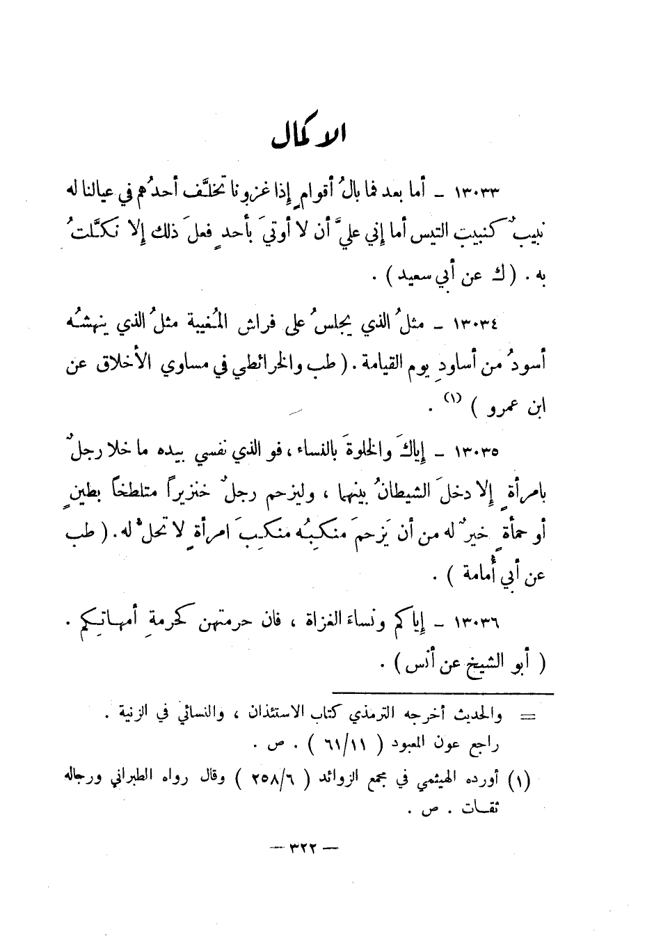 13034- مثل الذي يجلس على فراش المغيبة مثل الذي ينهشه أسود من أساود يوم القيامة. "طب والخرائطي في مساوي الأخلاق عن ابن عمرو"1